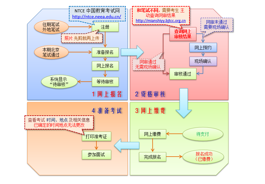 考生报名结束后,北京市教师资格认定事务中心将在24小时内对考生进行网上审核,未通过网上审核的考生,通过网上预约进行现场确认。通过面试审核确认并缴费成功的考生,可在2021年1月4日至2021年1月10日打印面试准考证。