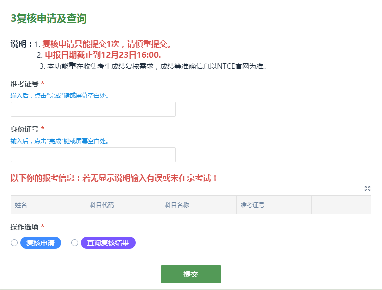 记者在成绩复核申请页面看到,每个考生的复核申请只能提交一次。同时,北京教育考试院提醒考生,成绩复核重在收集考生成绩复核需求,成绩等准确信息以NTCE(中小学教师资格考试)官网为准。