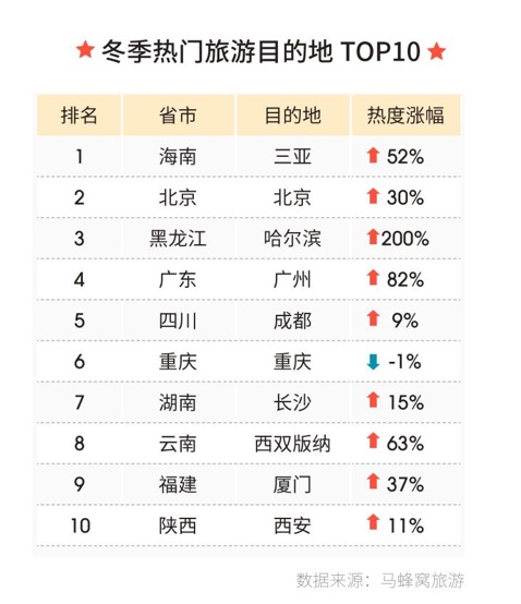 新京报讯(记者 王胜男)随着冬季来临,冰雪旅游、避寒旅游热度上涨。马蜂窝旅游12月9日发布的2020年冬季旅游蜂向标显示,今年冬季国内旅游热度排名前十的目的地分别是三亚、北京、哈尔滨、广州、成都、重庆、长沙、西双版纳、厦门和西安。其中,冰城哈尔滨冬季旅游热度涨幅达到200%,云南的西双版纳凭借边境村寨的民俗风情吸引了大批游客,旅游热度上涨63%。