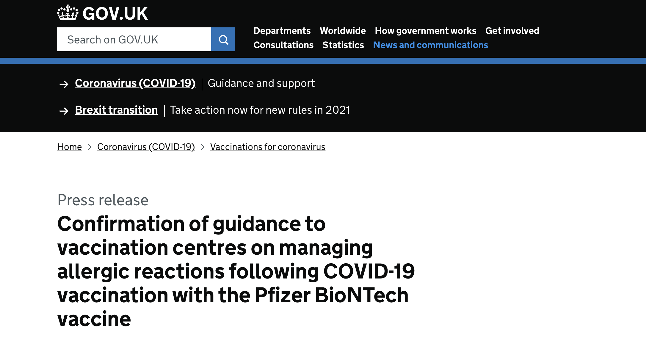 据英国天空新闻网报道,2人出现过敏反应后,负责疫苗研发的辉瑞公司在一份声明中表示,“作为预防措施,MHRA已经更改了接种建议,并将就过敏反应的原因展开调查,以便充分了解疫苗或将带来的安全影响,辉瑞公司和BioNTech都将为该调查提供支持”。