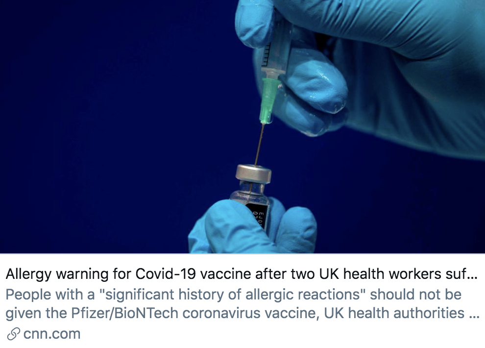 医护人员出现过敏反应后,英国政府对辉瑞疫苗发出警告。/ CNN报道截图