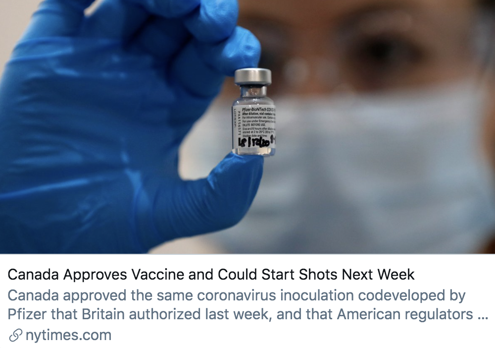 加拿大批准了辉瑞疫苗,最快将于下周开始接种流程。/ 《纽约时报》报道截图