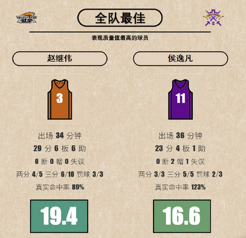 赵继伟本场外线10投6中,全场29分创个人生涯新高,同时还有6个篮板、6次助攻且0失误。