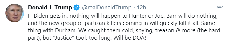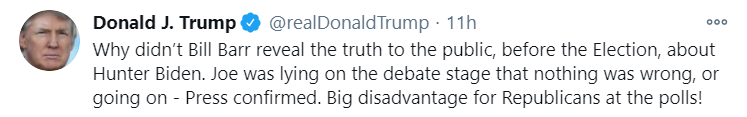 特朗普发布推文,指责巴尔不会调查拜登家族。/推特截图