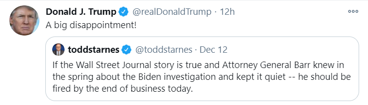 当地时间12月12日,特朗普转发了一条认为美国司法部长威廉·巴尔应该被解雇的推文,并附上如此评价。