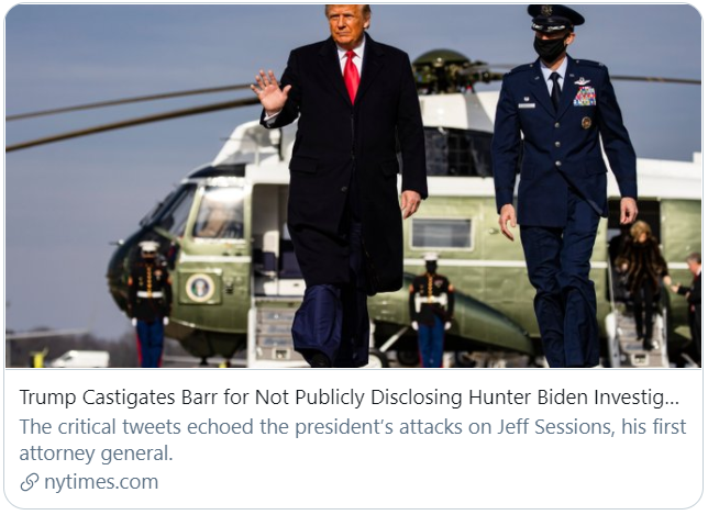 特朗普谴责巴尔没有公开针对亨特·拜登的调查。/《纽约时报》报道截图