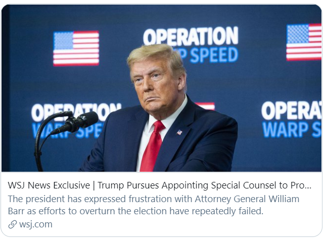据《华尔街日报》报道,特朗普竞选团队为扭转大选结果而进行的诉讼都陷入了困境,他现在希望任命一名特别检察官来调查大选中的欺诈指控以及亨特·拜登的税务案件。