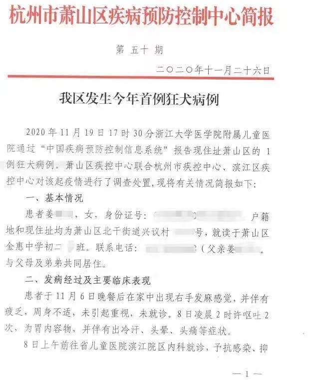 新京报讯(记者 薄其雨 实习生 慕宏举 毕卿)15日,新京报记者从浙江大学医学院附属儿童医院获悉,罹患狂犬病的初中女生姜某某已处于脑死亡状态。现家属没有放弃治疗,姜某某仍在重症监护室接受治疗。萧山区疾控中心一负责人告诉新京报记者,目前,区疾控已联合市疾控对该起疫情进行调查处置并及时采取相关控制措施。