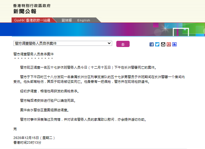 警方于下午四时三十八分发现一名隶属长洲分区刑事支援队的五十七岁男警员于休班期间在长洲警署一个房间内受伤。他头部有枪伤,其后于现场被证实死亡。他身旁有一把佩枪,警方并在现场检获遗书。
