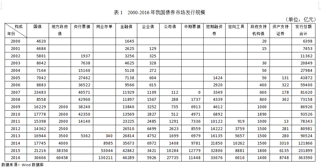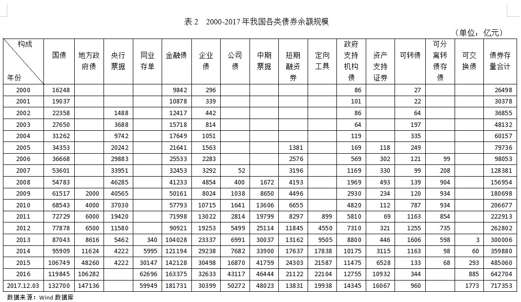 从债券品种和类型看,中国债券市场主要由国债、地方政府债、金融债券、企业(公司)债、可转换债、短融债、央行票据等组成,其中国债是规模较大、最具有影响力的市场基石债券,金融债是余额最大的债券品种。地方政府债虽然历史短,但发展速度快,截止到2017年12月3日,余额已超过国债仅次于金融债上升到第二大债券品种。表1和表2分别说明2000-2016年我国各类债券的发行规模和到2017年12月的余额(存量)变动情况。