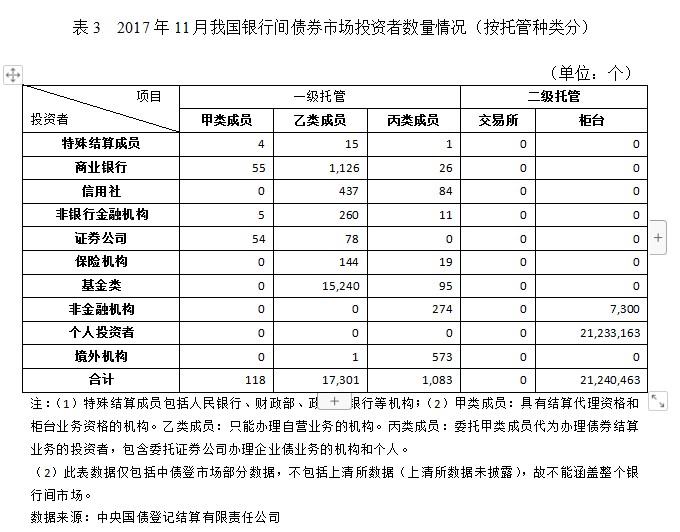 我国债券市场以银行间债券市场为主。据央行统计,在2017年10月底债券市场托管余额72.4万亿元中,由银行间债券市场托管的余额就达64.2万亿元。进入银行间市场进行交易和投资的主体,有一定的资格限定,除央行、财政部和政策性银行等特殊成员外,主要表现为各类金融机构、基金管理公司,近几年开始有境外机构和非金融性机构投资者以丙类账户进入,个人投资者只能在交易所债券市场进行投资,不允许进入银行间市场,具体成员数见表3。