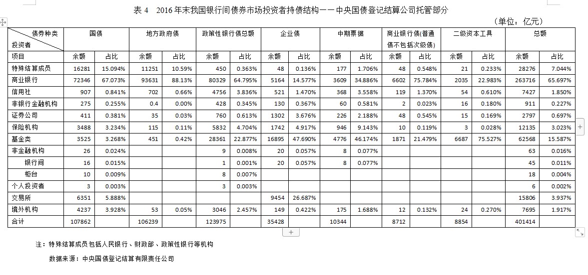 由于制度限制,商业银行不持有在交易所债券市场交易的公司债,截止到2016年末,其只持有银行间市场企业债的14.58%。商业银行共持有银行间债券市场各类债券余额309,939亿元,占比达59.24%。不考虑央行、财政部等特殊成员外,排在第二的债券投资者是各类基金,分别持有国债3.27%,政策性银行债在22.88%,企业债47.69%,商业银行债21.48%,在中期票据和二级资本工具余额中,基金类投资者持有比例超过商业银行,分别为46.17%和75.53%。在银行间债券市场,基金类投资者持有的各类债券余额62,568亿元,占银行间市场债券余额的11.96%。