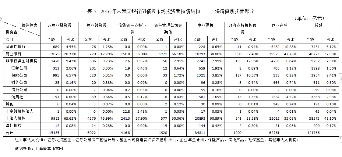 从表4和表5中可以看到,我国银行间债券市场的持有主体主要是商业银行,截至2016年末,在国债、政策性银行债和其它商业银行债中,分别持有这三类债券全部余额的67.07%, 62.8%和75.78%。交易所债券市场的持有主体主要是证券公司,据中证登2016年统计年鉴披露的数据可知,截止2016年末,包括深、沪两市在内的证券结算系统参与人,证券公司有225家,占总数的62.5%。
