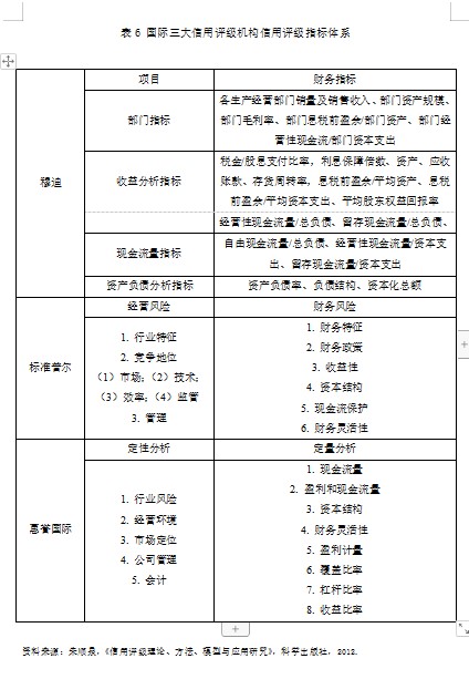 我国信用评级行业起步较晚,经验不足,但在信用评级指标体系设计等技术层面,由于借鉴、参考了穆迪、标普和惠普三大著名信用评级机构的一些指标设计,并结合中国的实践,已初步形成了自身的指标体系和分析框架。