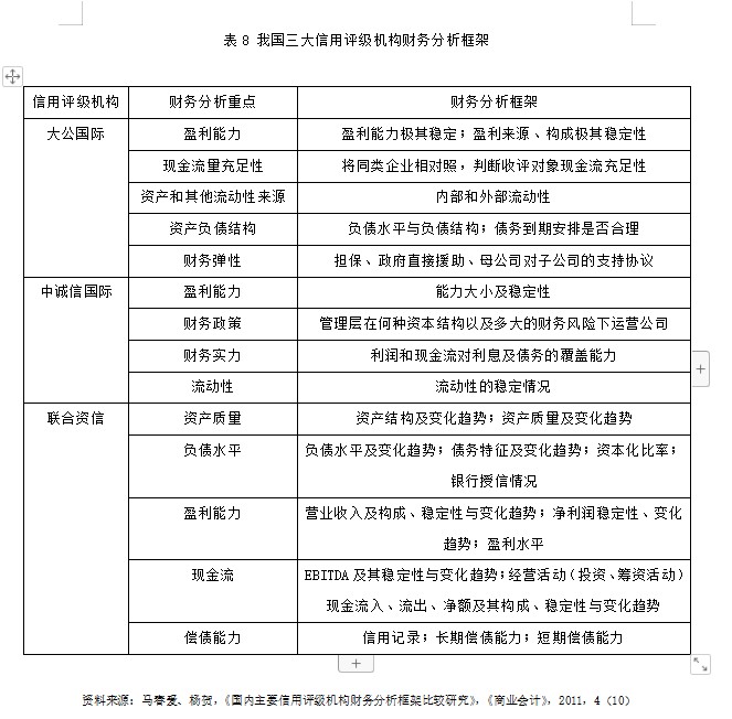 9、 马春爱、杨贺,《国内主要信用评级机构财务分析框架比较研究》,《商业会计》,2011,4(10)