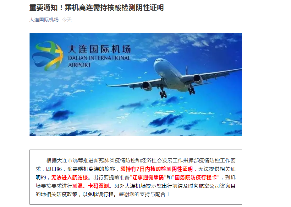 新京报快讯 据大连国际机场微信公众号消息,12月22日,大连国际机场发布通告,根据大连市统筹推进新冠肺炎疫情防控和经济社会发展工作指挥部疫情防控工作要求,即日起,确需乘机离连的旅客,须持有7日内核酸检测阴性证明,无法提供相关证明的,无法进入航站楼。