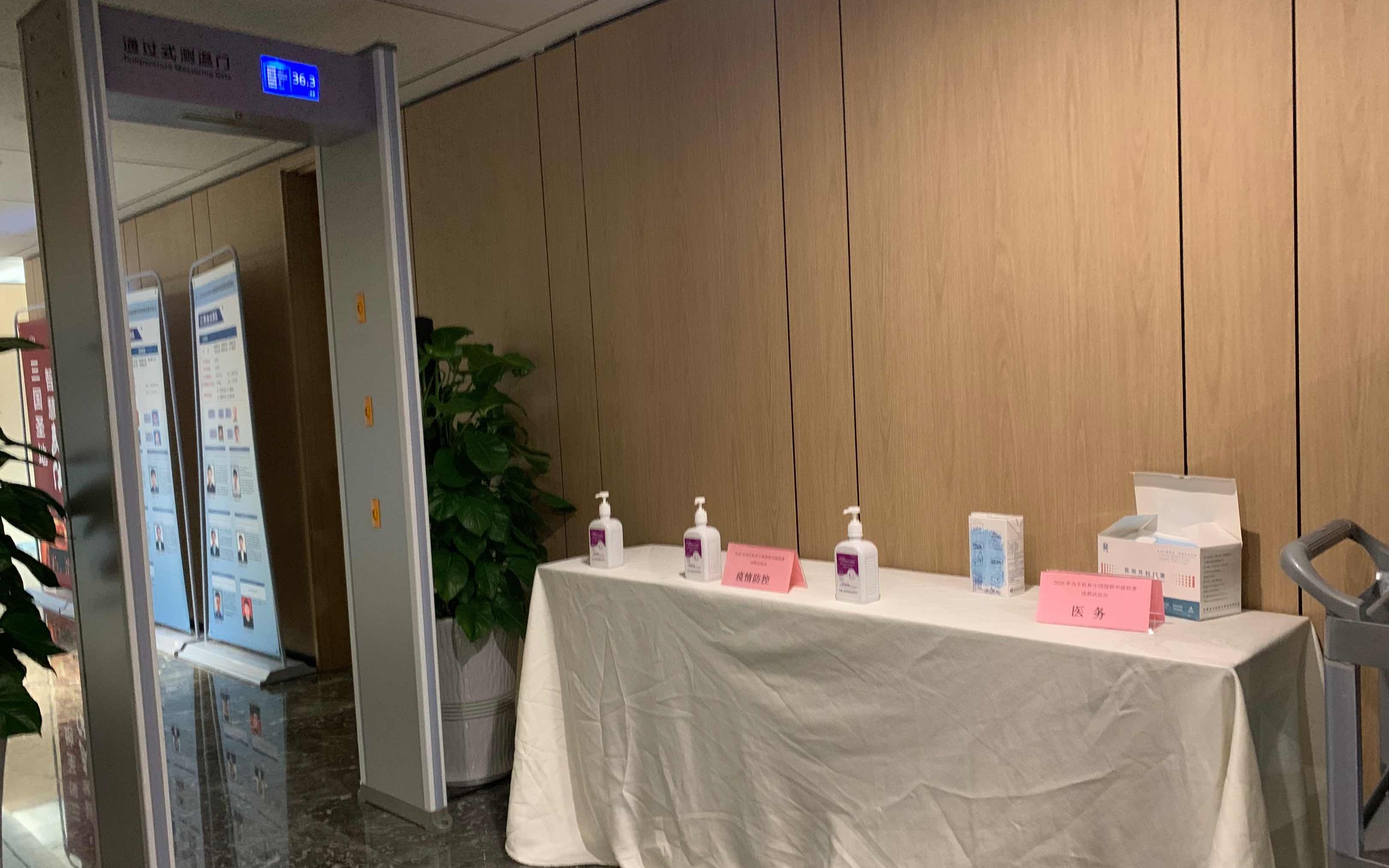 赛场门外设有测温仪和防疫物品。新京报首席记者 孙海光 摄
