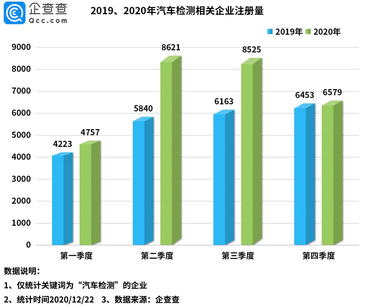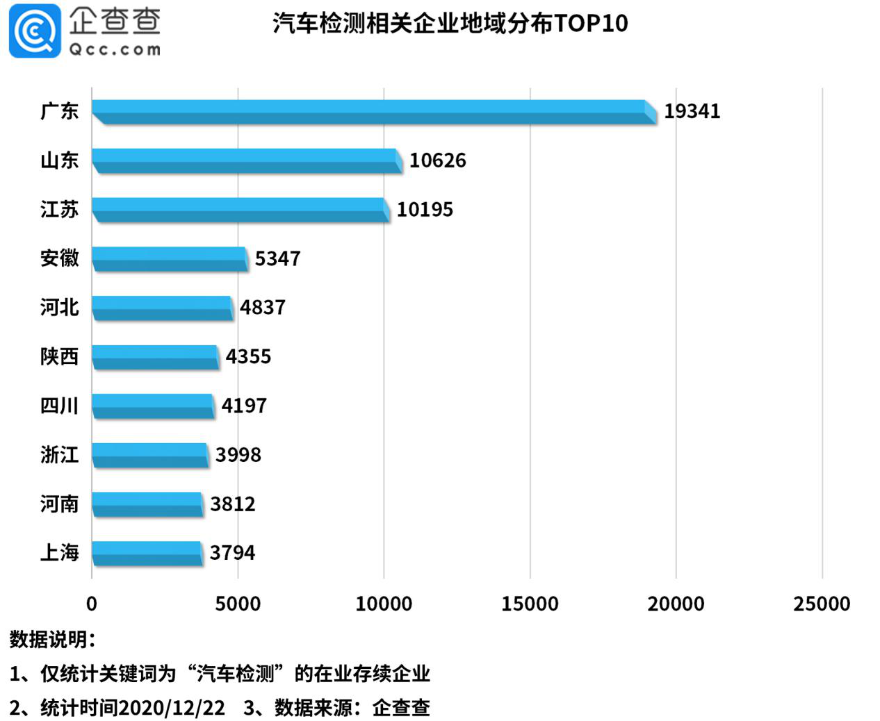 企查查数据显示,截至2020年底,我国共有近12万家汽车检测相关企业,广东、山东和江苏分别以1.9万家、1.1万家和1.0万家位列前三。今年以来相关企业共新注册2.8万家,同比增长26%,其中四季度注册量达6579家。
