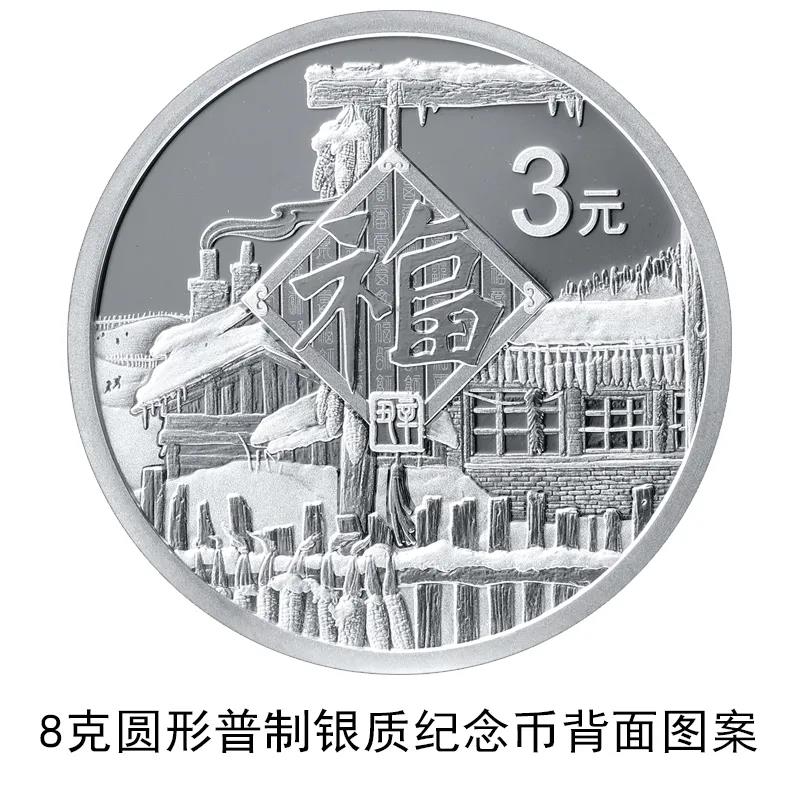 8克圆形银质纪念币背面图案为“福”字造型,衬以东北民居典型造型组合设计,并刊面额。
