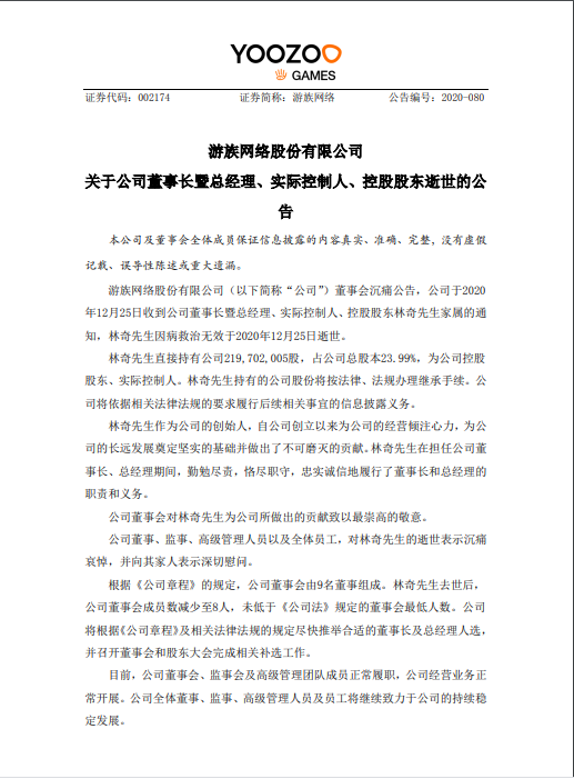 新京报快讯 据深交所网站12月25日消息,游族网络股份有限公司公告,公司于2020年12月25日收到公司董事长暨总经理、实际控制人、控股股东林奇先生家属的通知,林奇先生因病救治无效于2020年12月25日逝世。
