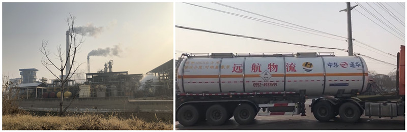 注:记者走访期间,八一化工冒烟的烟筒(左图)和对硝基氯苯运输车辆进出厂区(右图)