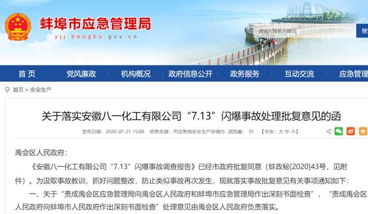 今年7月,蚌埠市应急管理局安全生产协调办就八一化工厂“7·31”闪爆事故发文表示,要汲取事故教训,抓好问题整改,持续开展危险化学品“打非治违”,推动化工产业转型升级,有效防范危险化学品事故发生。同时,责成禹会区应急管理局向禹会区人民政府和蚌埠市应急管理局作出深刻书面检查,责成禹会区人民政府向蚌埠市人民政府作出深刻书面检查。