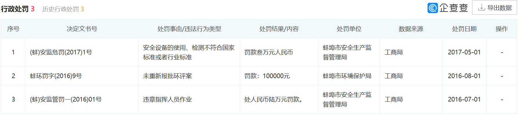 此外,企查查显示,八一化工曾在2016年至2017年间三次受到行政处罚,处罚事由包括违章指挥人员作业、未重新报批环评案,以及安全设备的使用、检测不符合国家标准或者行业标准。