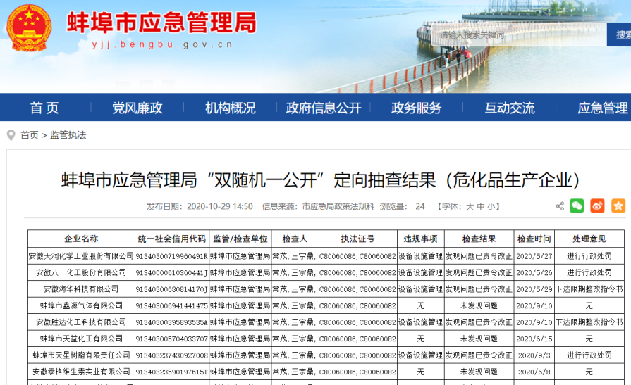 与此同时,今年5月,蚌埠市应急管理局曾进行“双随机一公开”定向抽查,八一化工因“设备设施管理”被行政处罚。