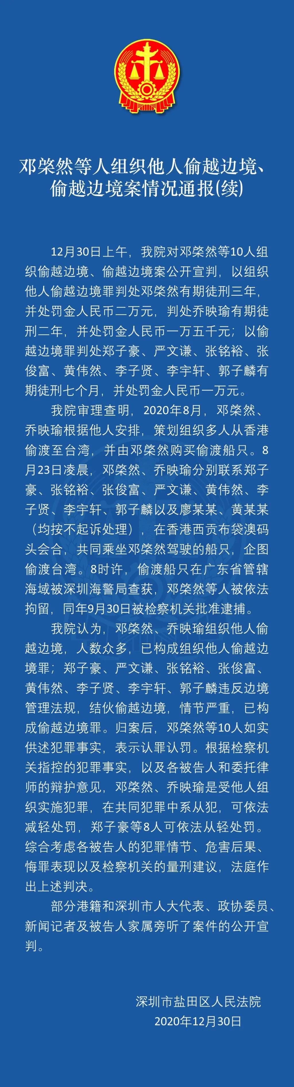 新京报快讯 据盐田法院官微消息,30日,邓棨然等人组织他人偷越边境、偷越边境案情况通报(续)发布,以下为全文: