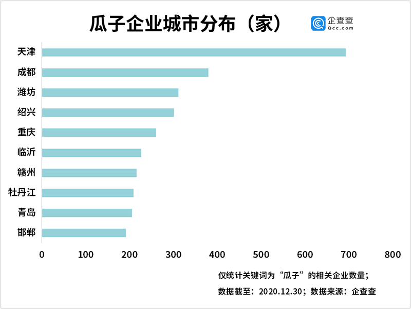 从全国城市排名来看,企查查数据显示,天津以692家企业排名第一,成都位居第二。而有着瓜子产业集散地之称的山东潍坊,以300余家企业排名第三。