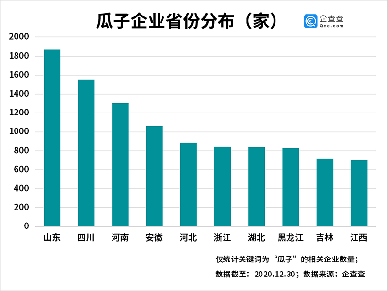 从省份排名来看,企查查数据显示,山东、四川以及河南三省的瓜子企业数量排在前三位,分别有1866家、1553家和1305家。