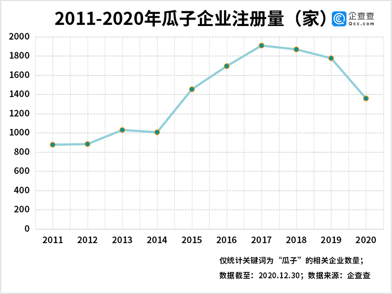 企查查数据显示,2011年以来的十年间,瓜子企业注册量最开始呈缓慢增长趋势,2015年增速开始加快,当年共注册瓜子企业876家,同比增长44%。2017年瓜子企业注册量达到了最高点,共1908家,同比增长13%。随后几年中瓜子企业注册量呈逐年递减趋势,2020年共注册1358家,同比减少24%。