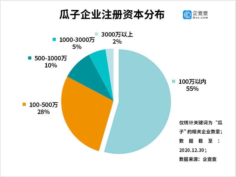 瓜子企业中个体户占多数,共1.54万家,占比约为84%。从注册资本分布来看(个体工商户除外),企查查数据显示,55%的瓜子企业注册资本集中在100万元以内,分布在100万-500万元和500万-1000万元的占比在28%和10%左右。