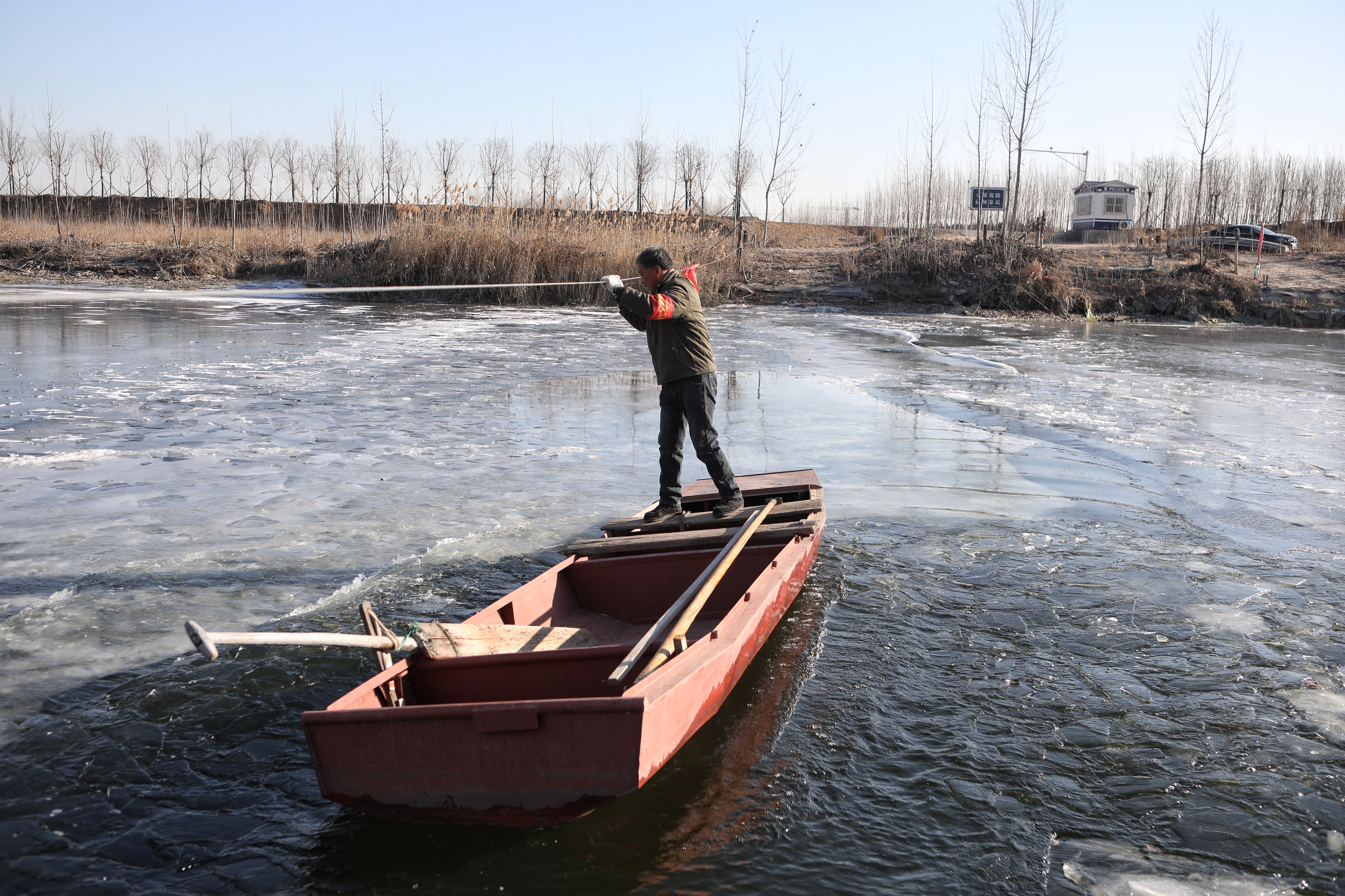 赵作喜在用小船破冰。新京报记者 王嘉宁 摄