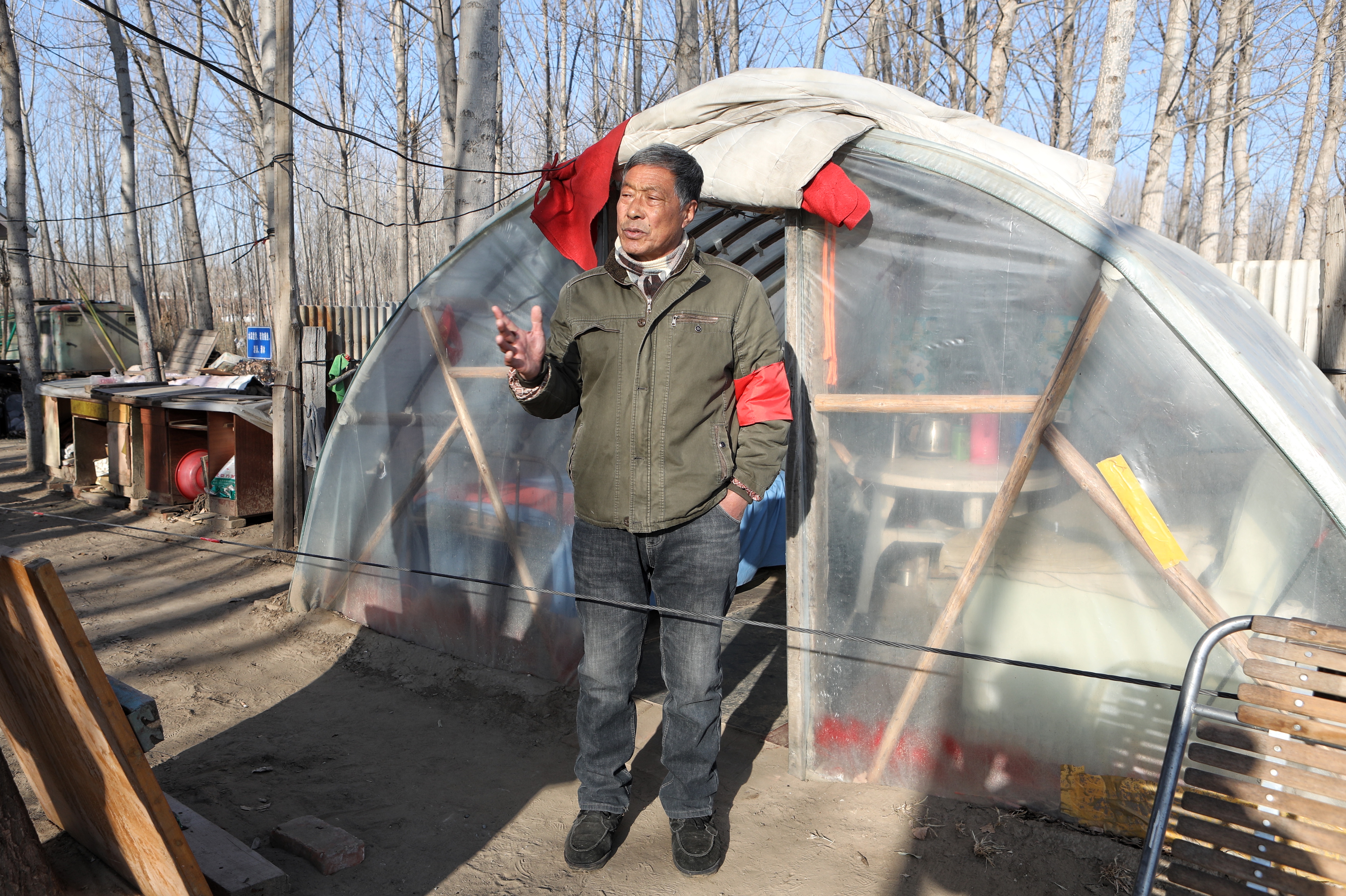 没人过河时,赵作喜就猫在岸上那个用竹竿和塑料布搭起来的简易棚中,里面摆着一张小床和桌子,“这里就是我的避风港。” 赵作喜很知足,十多年前,这里只有半圈玉米秸秆,狡黠的西北风从四面八方钻进他的领口。