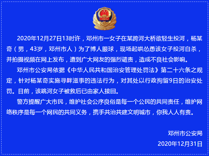 新京报快讯 据南阳市公安局官方微信1月1日消息,2020年12月27日,邓州市一女子在某跨河大桥欲投河,一男子现场起哄怂恿该女子投河自杀,并拍摄视频发布在网上。2020年12月31日,警方发布相关警情通报。