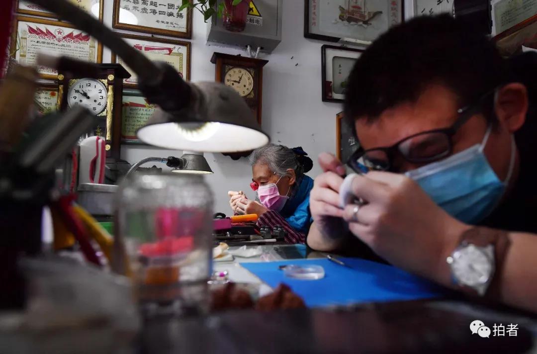 △ 2020年11月25日,朝阳区甘露园,祖孙三代传承至今的京时表店内,店主刘宪平和儿子袁亮在为顾客修表。创立于上世纪80年代初的京时表店是北京第一批个体修表店。
