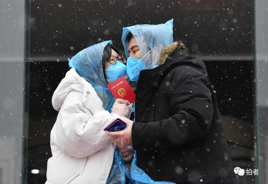 △ 2020年2月14日,朝阳区民政局婚姻登记处,领完证的一对新人隔着口罩说悄悄话。由于疫情,当时北京市婚姻登记机构全部实施网上预约,只保留法定程序。结婚宣誓、合影留念等环节全部取消,预计每对新人10分钟左右就能办完所有领证手续。