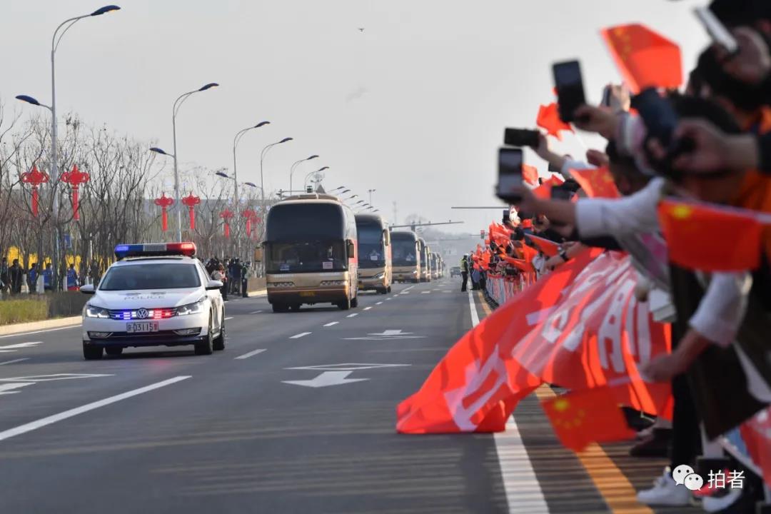 △ 2020年4月6日下午5时30分许,载有援鄂医疗队员的十余辆大巴车抵达位于延庆区的集中隔离点。医疗队员亲友夹道欢迎。