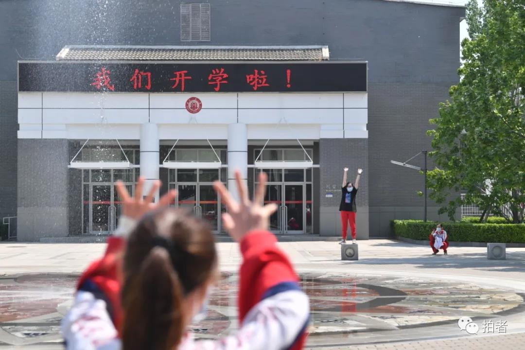 △ 2020年4月27日,北京一零一中,两名久未见面的同学隔着老远兴奋地打招呼,当天,他们结束了“史上最长寒假”。北京市254所学校迎来4.9万名高三年级学生返校复课。