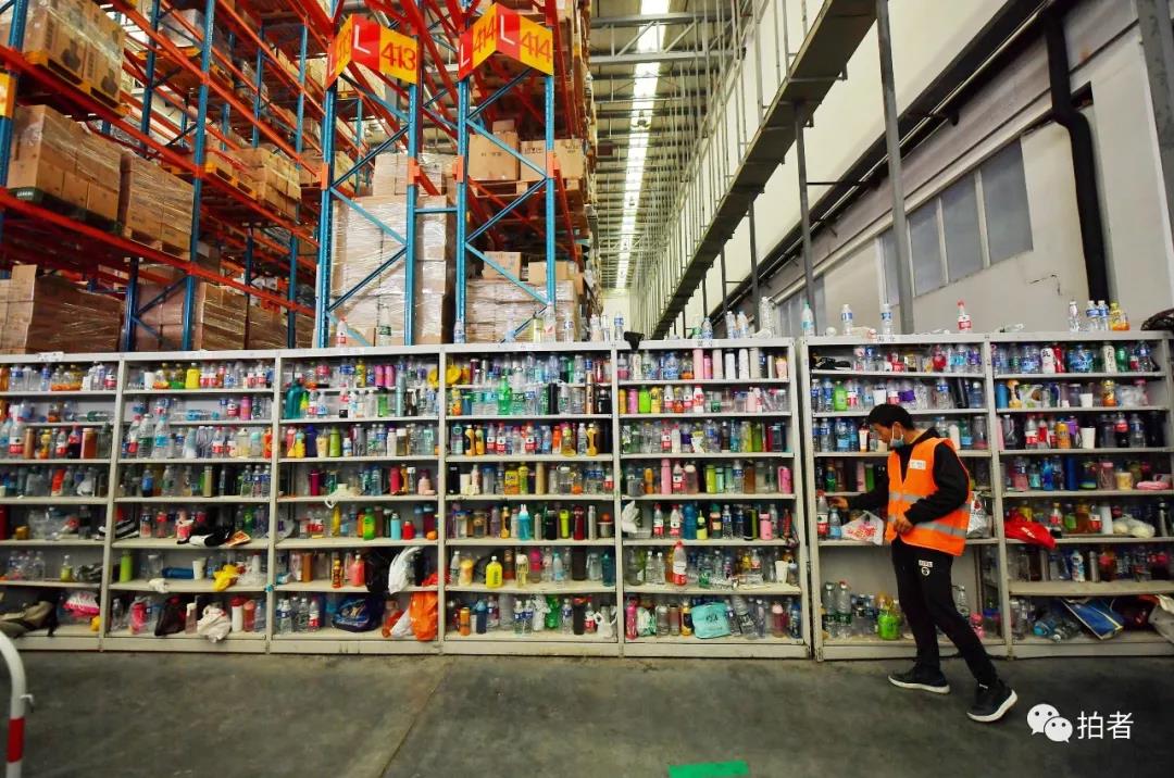 △ 2020年11月11日,通州区一处苏宁物流基地,快递分拣人员的水杯摆满了车间外的铁架。