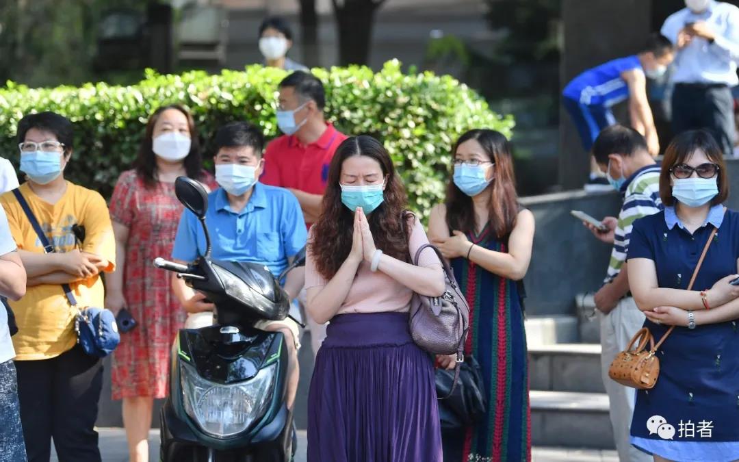 △ 2020年7月7日,北京高考首日,一名家长在北京八中考点外为考生祈福。