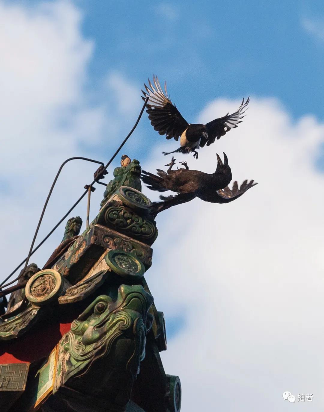 △ 2020年5月24日,景山公园万春亭,喜鹊和乌鸦在进行“空战”。