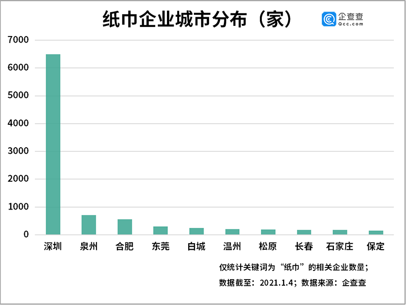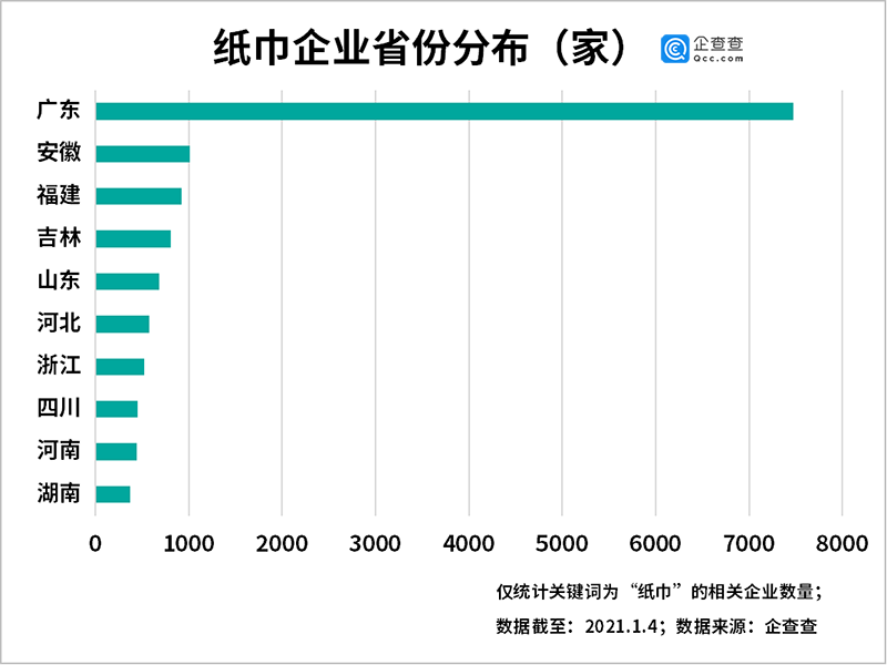 从省份分布来看,企查查数据显示,广东省的纸巾企业数量遥遥领先,以7474家居于首位,其中6498家分布于深圳,占广东省的87%。紧随其后的安徽、福建、吉林和山东四省的纸巾企业数量分别为1015家、920家、808家和682家。