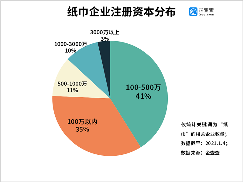 从注册资本来看(个体工商户除外),企查查数据显示,注册资本在100万-500万元的企业数量最多,占比约为41%,注册资本在100万元以内和500万-1000万元的占35%和11%。从行业分布来看,批发和零售业的纸巾企业共1.12万家,占比高达69%。制造业共0.32万家纸巾企业。