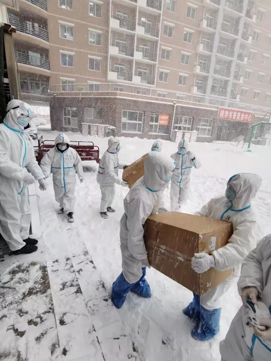 网传的照片中,一名身着防护服的人员骑着一辆载货三轮车,车斗里堆满纸箱,周围积雪很深,另有十多名身穿白色防护服的人员用力推车,在雪中艰难前行。