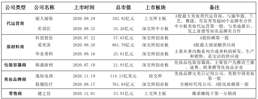 过去一年,美妆类企业上市主要集中在下半年。2020年7月,雅诗兰黛与迪奥的化妆品包装容器商锦盛新材以及“A股防晒第一股”科思股份,先后在深交所上市;9月,内酯系列合成香料供应商华业香料、全棉时代母公司稳健医疗、中小板美妆代运营第一股若羽臣、“A股最大玻尿酸供应商”爱美客、“A股最大美妆类代运营商”丽人丽妆,先后在深交所创业板和上交所主板上市;11月19日,美妆品牌完美日记母公司逸仙电商在美国纽交所上市,成为美股中国美妆第一股;12月1日,薇诺娜线下第一分销商健之佳在上交所主板上市。