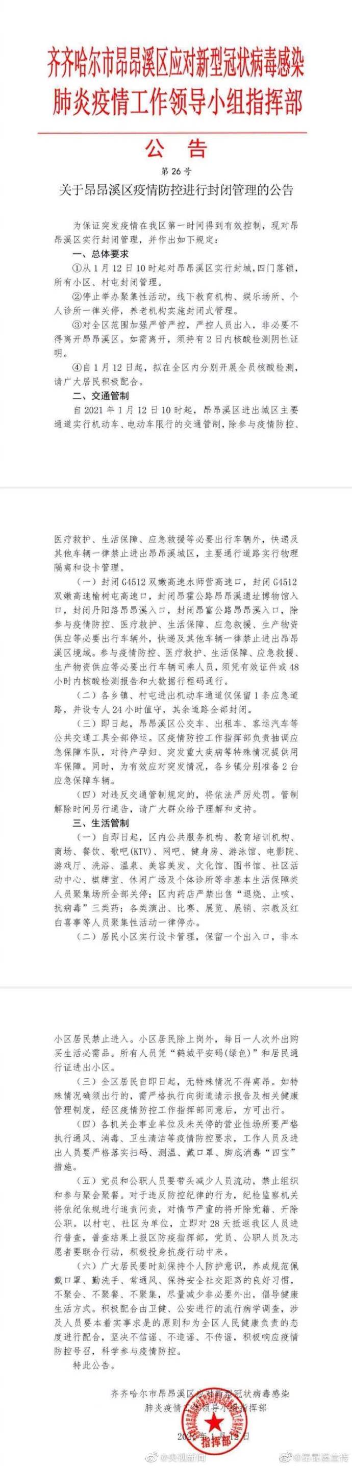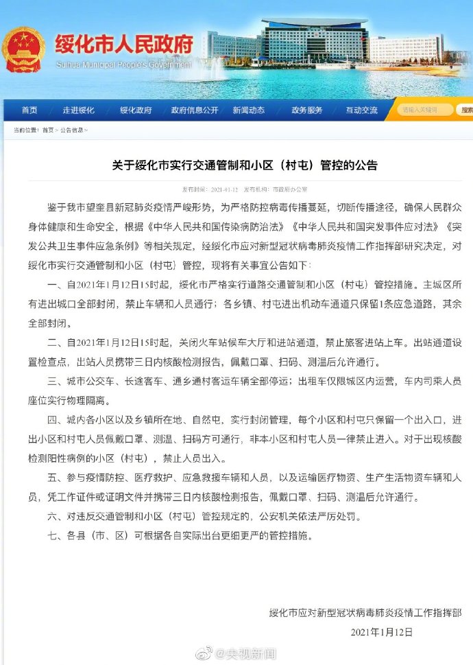据央视新闻消息,绥化市应对新型冠状病毒肺炎疫情工作指挥部发布公告:自1月12日15时起,绥化市严格实行道路交通管制和小区(村屯)管控措施。主城区所有进出城口全部封闭,禁止车辆和人员通行;各乡镇、村屯进出机动车通道只保留1条应急道路,其余全部封闭。另据昂昂溪宣传消息,齐齐哈尔市昂昂溪区封闭管理,并执行交通管制、生活管制。