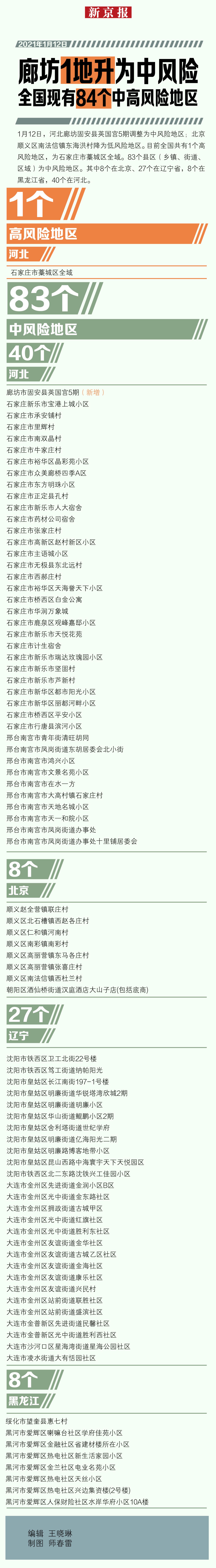 1月12日,廊坊一地升为中风险;顺义南法信镇东海洪村降为低风险地区。全国现有1个高风险地区,在河北;83个中风险地区,其中8个在北京、27个在辽宁,8个在黑龙江,40个在河北。自1月13日8时起,齐齐哈尔市昂昂溪区大五福玛村升为中风险地区。