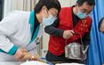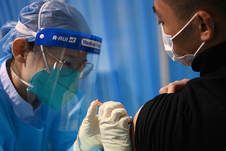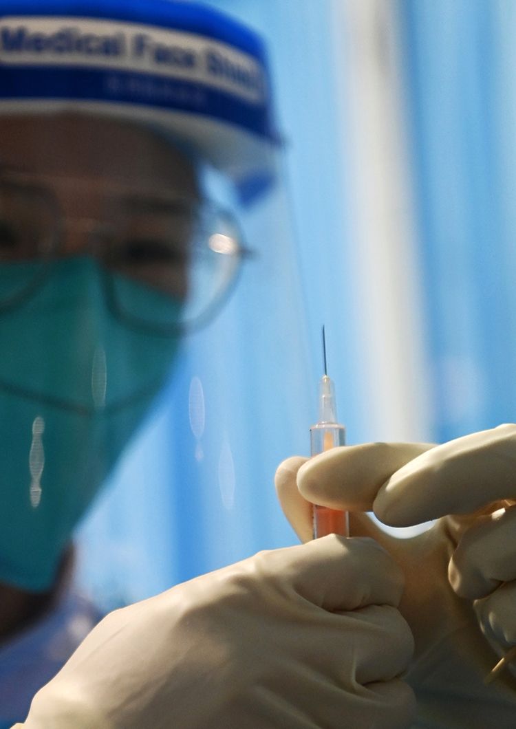 医护人员准备为接种人员注射疫苗。